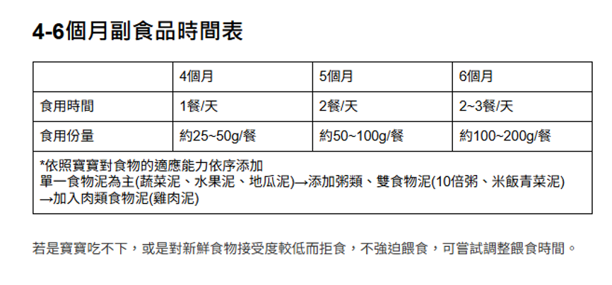 4個月先以少量 (1-2茶匙)開始,來練嬰兒咀嚼、吞嚥,每次增加一種新的食材食用3-5天,確定無腹瀉、嘔吐、皮疹等過敏症狀,再增加新的食材。